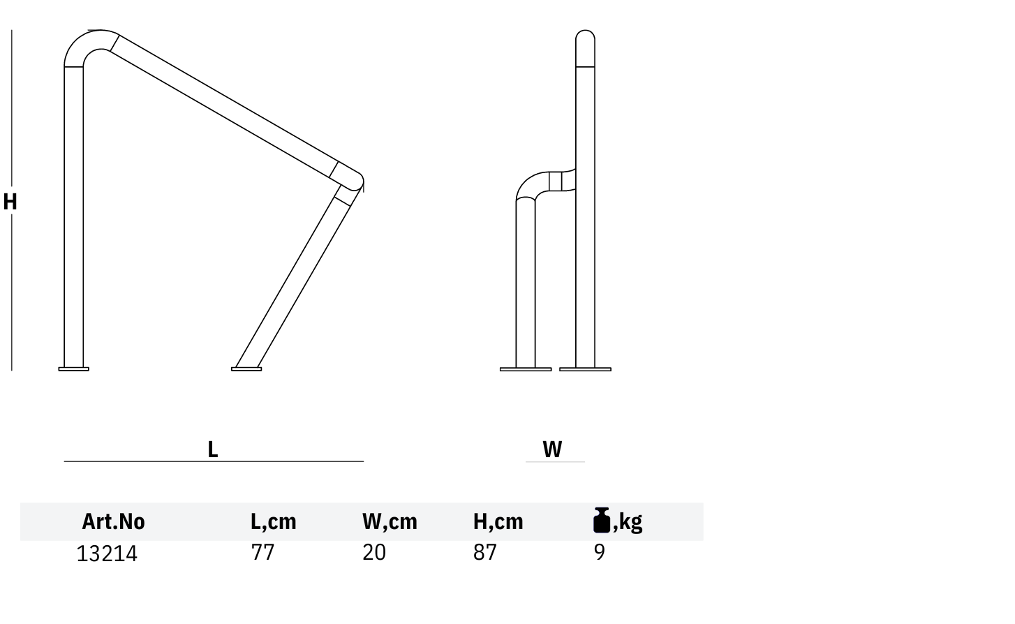 Velonovietnes 13214 uzbūve, nodrošinot priekšējā riteņa atbalstu, ļauj velosipēdus novietot stabili, izvairoties no to sagāšanās un savstarpējas saķeršanās, līdz ar to ievērojami atvieglo veloturētāja lietošanu. Neregulārā forma un robustā konstrukcija, līdzīgi kā velonovietnei 13213, ļauj tai izcelties uz apkārtējās vides fona.Velostatīvs 13214, izmantojot priekšējā riteņa fiksāciju, paredzēts vienam velosipēdam vai elektrovelosipēdam, taču nepieciešamības gadījumā iespējams novietot vēl vienu otrā statīva pusē.