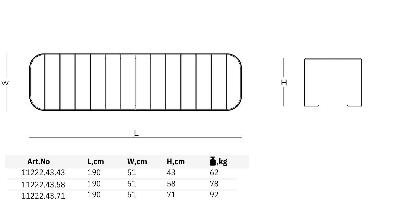 | IZMĒRI, cm | •51(W) x 190(L) x 43 (H) – Art.No 11222.43.H1 •51(W) x 190(L) x 58 (H) – Art.No 11222.43.H2 •51(W) x 190(L) x 71 (H) – Art.No 11222.43.H3 ![]() |
