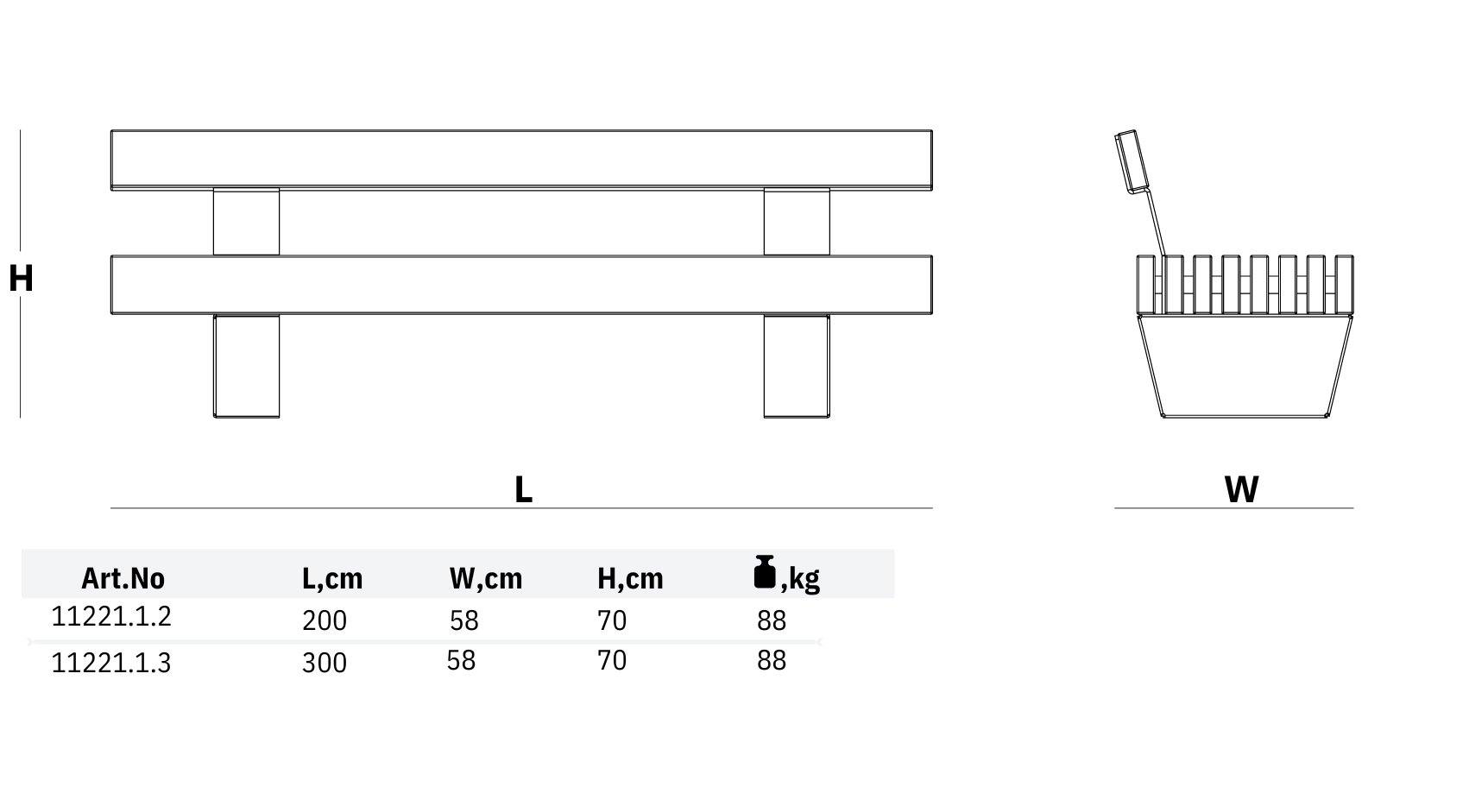 | IZMĒRI, cm | •58(W) x 200(L) x 70 (H) – Art.No 11221.01 •58(W) x 300(L) x 70 (H) – Art.No 11221.05 ![]() |