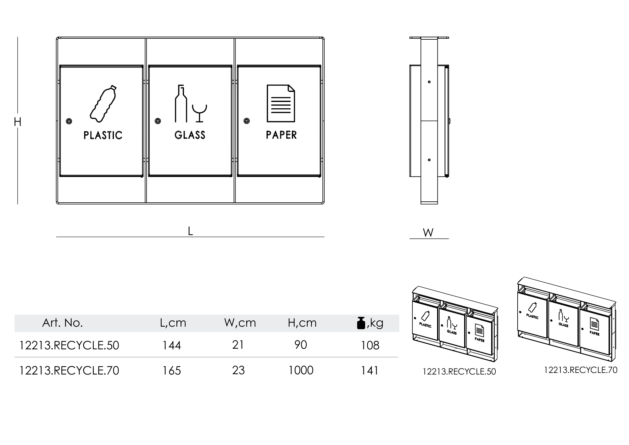 | IZMĒRI, cm | •21(W) x 144(L) x 90 (H) – Art.No 12213.RECYCLE.50 •23(W) x 165(L) x 1000 (H) – Art.No 12213.RECYCLE.70 ![]() |