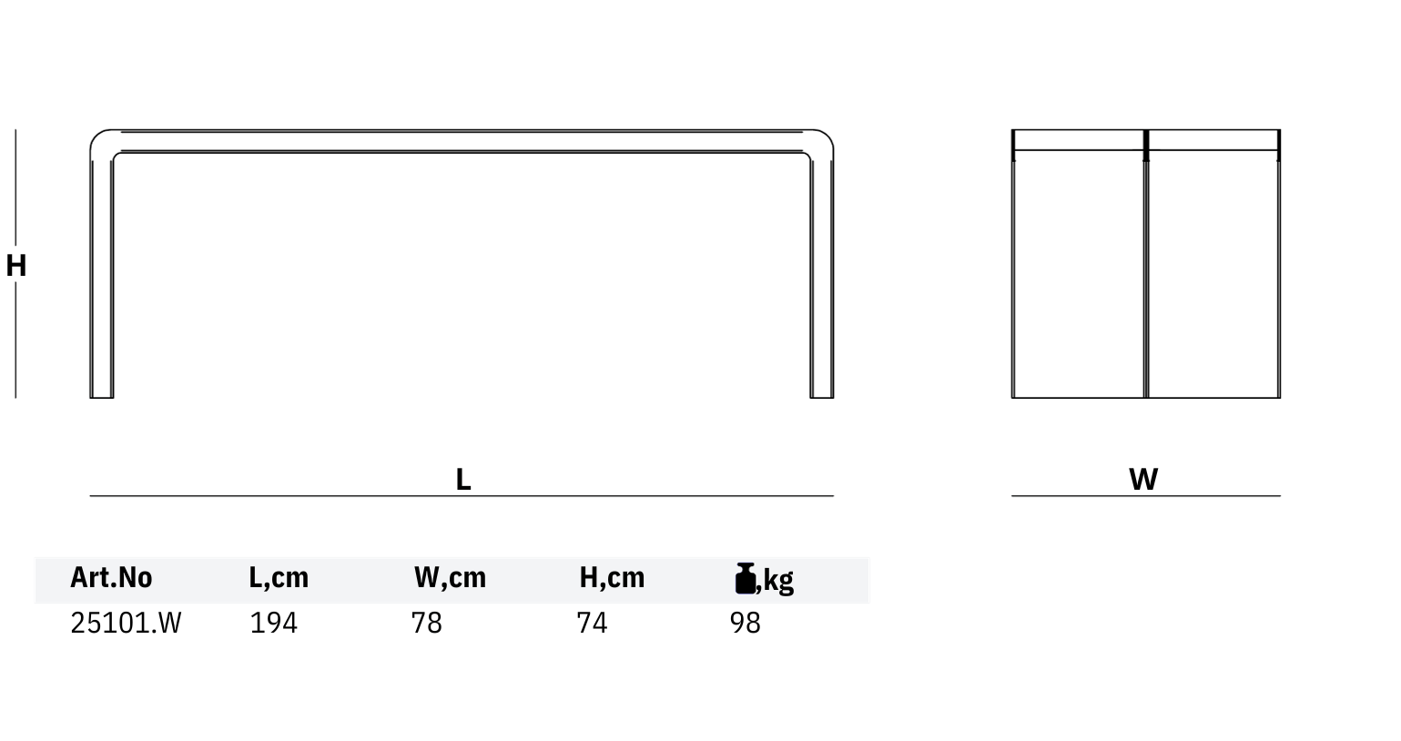 Galds 25101.W tiek piedāvāts kombinācijā ar solu 11220.W un solu 11220.65.W, abi modeļi – galds un soli, ir pieejami arī bez koka virsmas. Pateicoties stingrajai un stabilajai konstrukcijai, galds 25101.W komplektā ar solu 11220.W būs īpaši piemērots plašām publiskām vietām – laukumiem, promenādēm un gājēju ielām.