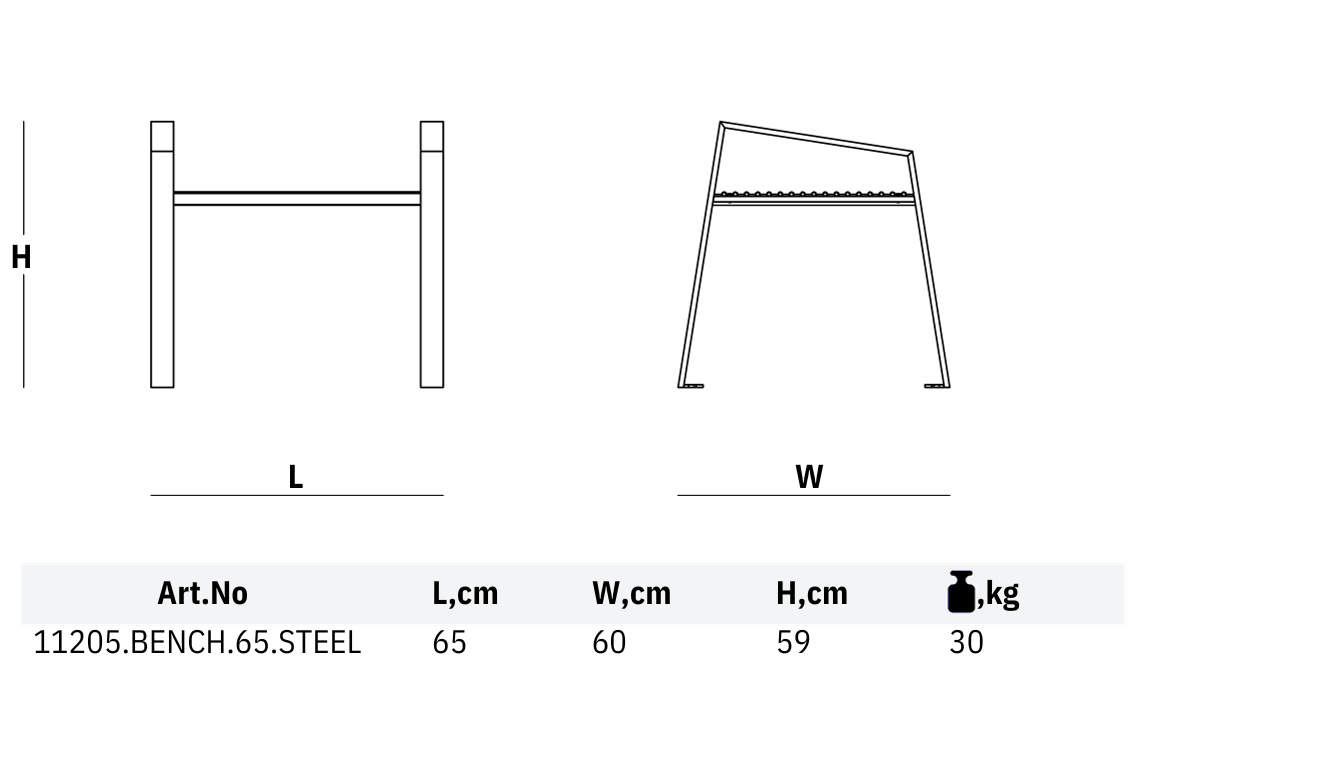 The bench 11205.BENCH.65.STEEL is manufactured with pre-drilled holes and supplied with bolts, and it requires easy self-assembly.