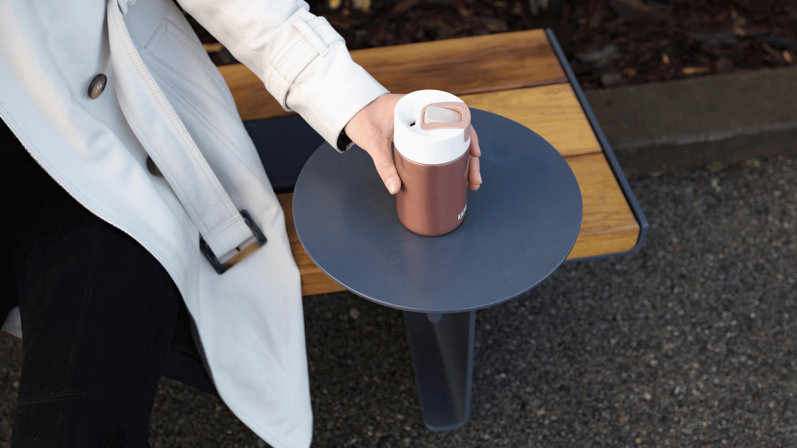The bench is available in various configurations – with and without armrest, with an optional round table 11210.TABLE.D30 attached to the seat, or a side table 11210.TABLE between the benches.