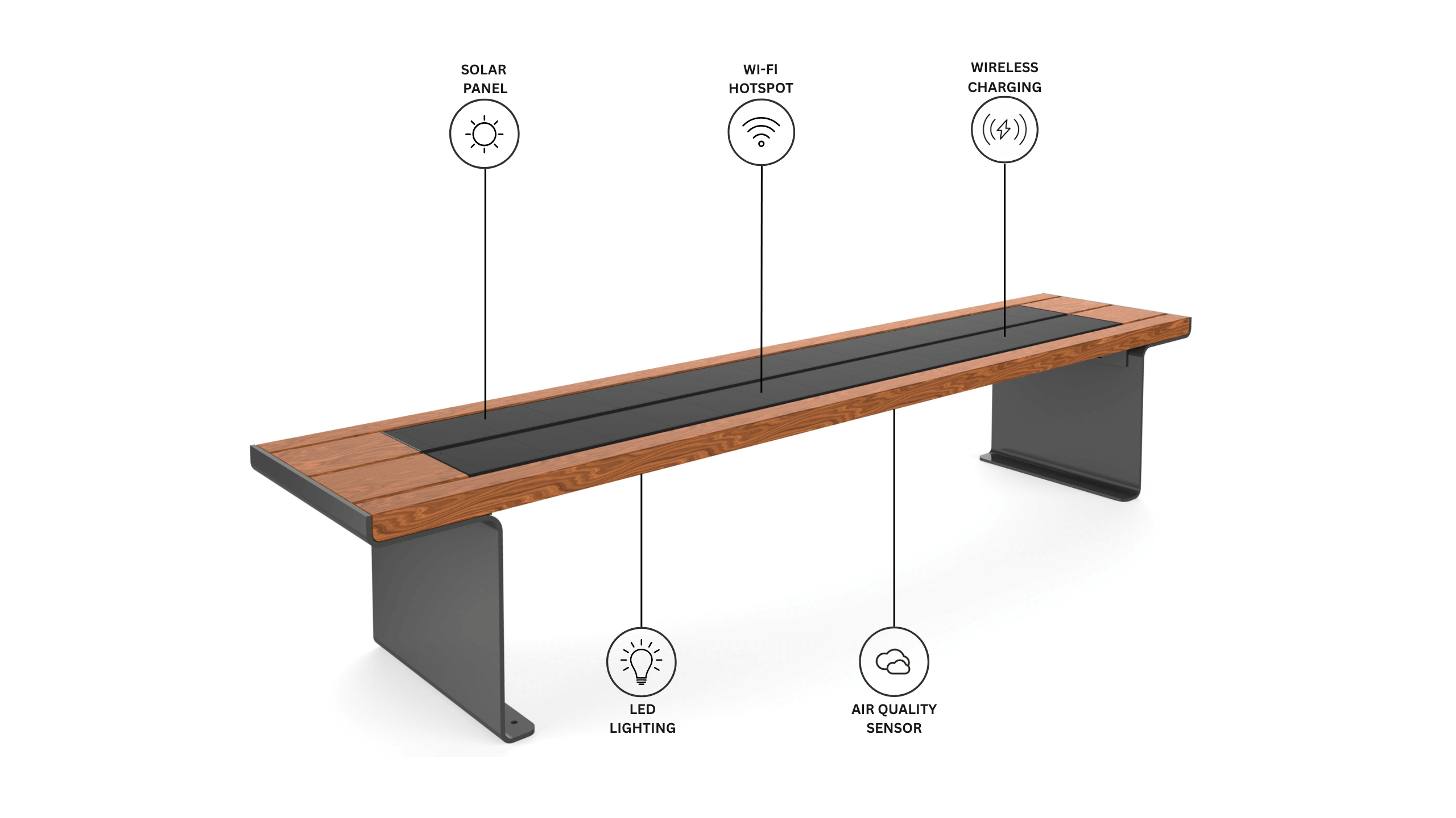 For enhanced functionality, the Bench 11210.SOLAR.BENCH offers modular add-ons, including an air quality sensor and a WiFi router integrated into a separate solar-powered panel.