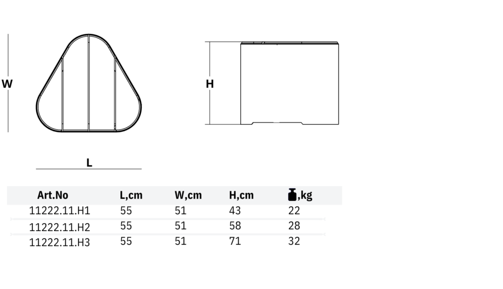 | DIMENSIONS, cm | •51 (W) x 55 (L) x 43 (H) – For Art.No 11222.11.H1 •51 (W) x 55 (L) x 58 (H) – For Art.No 11222.11.H2 •51 (W) x 55 (L) x 71 (H) – For Art.No 11222.11.H3 ![]() |