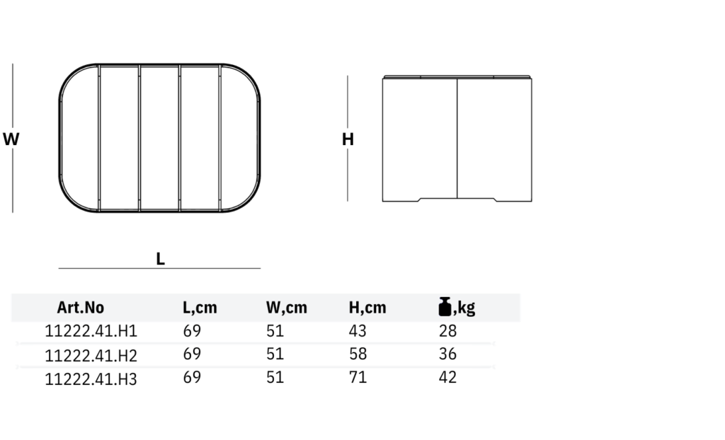 | DIMENSIONS, cm | •51(W) x 69(L) x 43 (H) – For Art.No 11222.41.H1 •51(W) x 69(L) x 58 (H) – For Art.No 11222.41.H2 •51(W) x 69(L) x 71 (H) – For Art.No 11222.41.H3 ![]() |