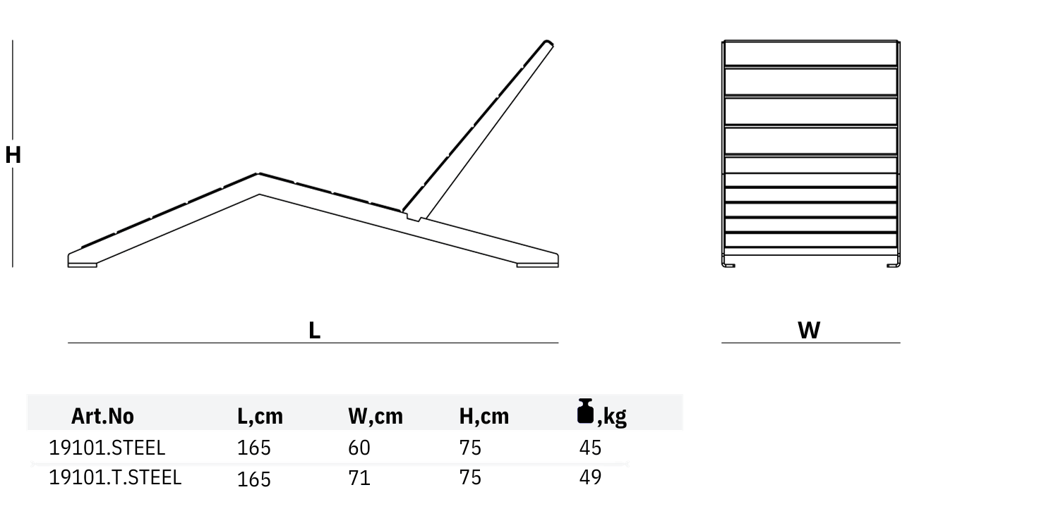 | DIMENSIONS, cm | •60(W) x 165(L) x 75 (H) – For Art.No 19101.STEEL •71(W) x 165(L) x 75 (H) – For. Art.No 19101.T.STEEL ![]() |