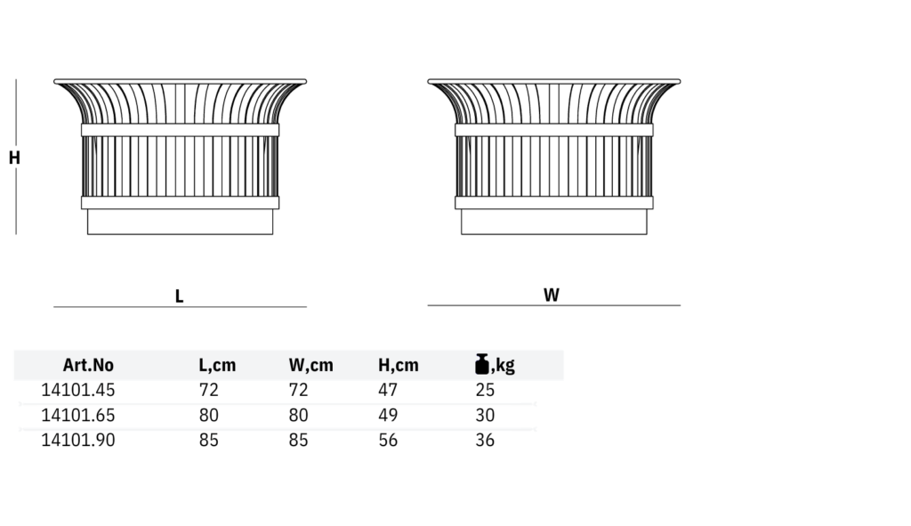 - Planter 14101 size range is 45L, 65L, and 90L capacities.