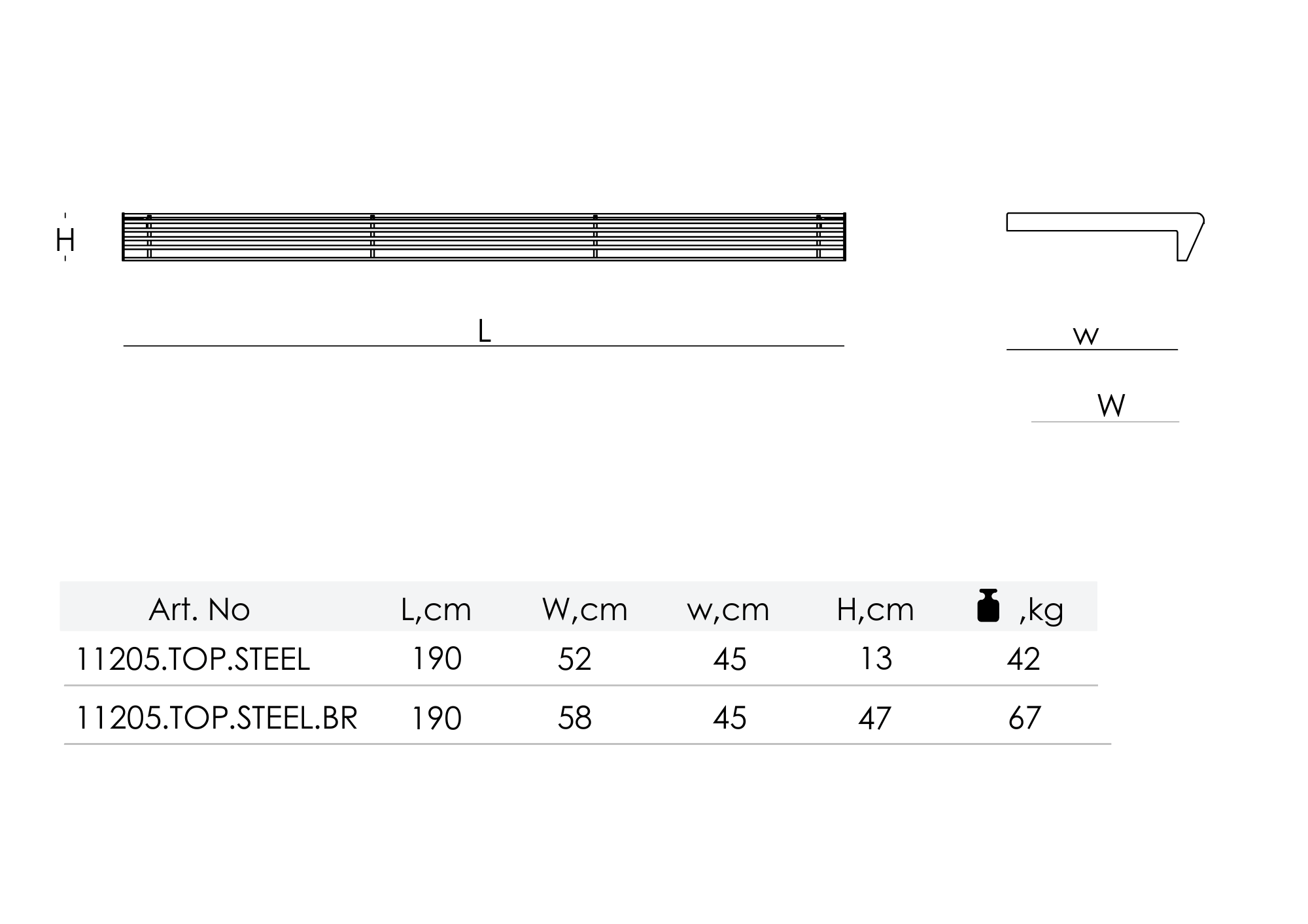 | DIMENSIONS, cm | 52 (W) x w (45) x 190 (L) x 13 (H) – For Art.No 11205.TOP.STEEL 58 (W) x w (45) x 190 (L) x 47 (H) – For Art.No 11205.TOP.STEEL.BR