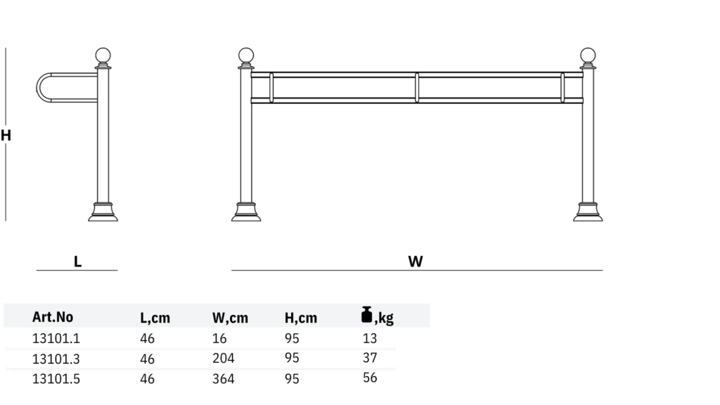 | DIMENSIONS, cm | •16(W) x 46(L) x 95 (H) – For Art.No 13101.1 •204(W) x 46(L) x 95 (H)- For Art.No 13101.3 •364(W) x 46(L) x 95 (H) – For Art.No 13101.5 ![]() |