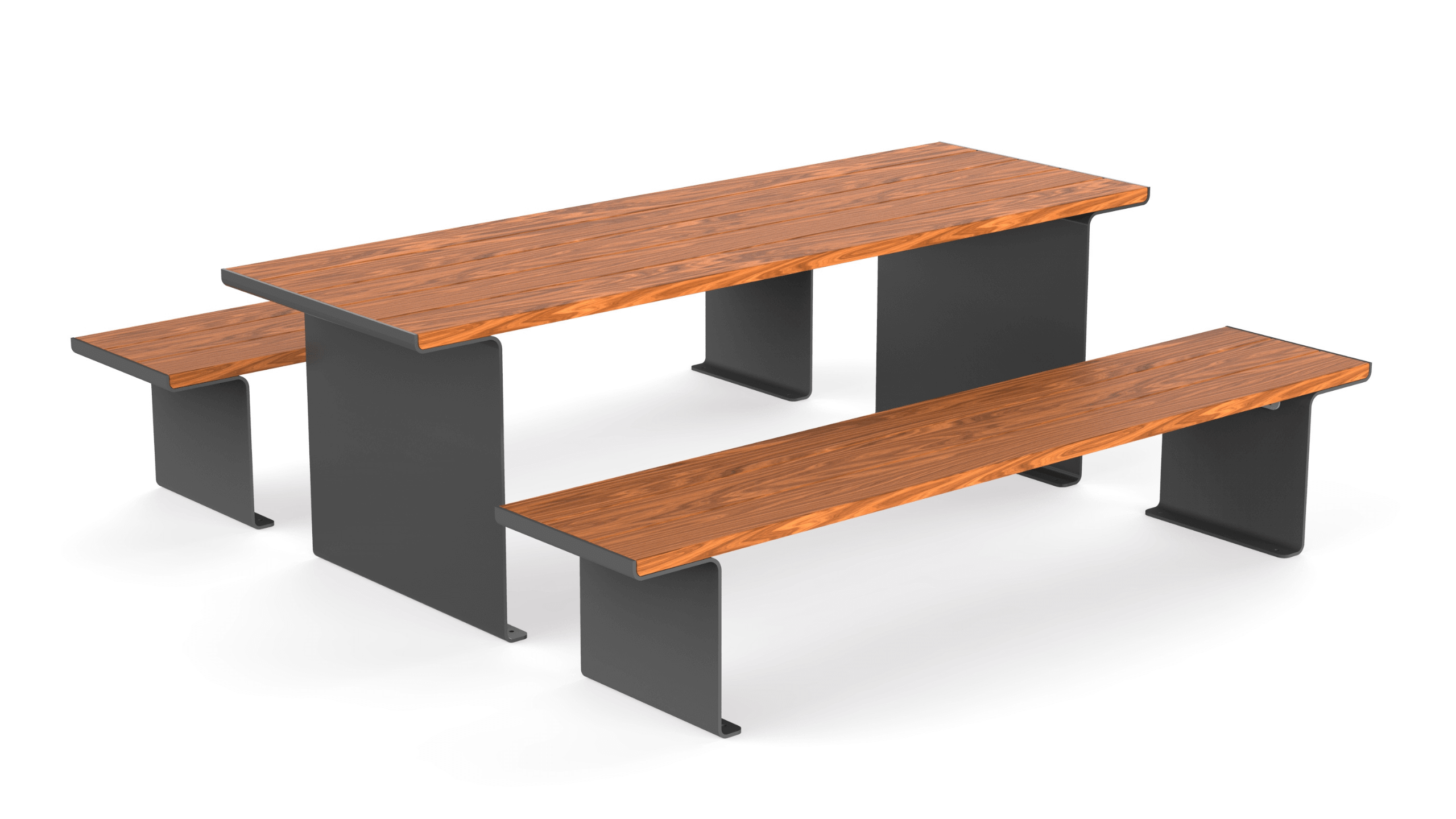 The Picnic Table 25106.220 is designed to create welcoming and inclusive environments, ensuring that everyone can participate in shared outdoor experiences. The frame is made of thick bent steel slate giving its unique monolithic look. It is built to withstand harsh outdoor conditions while maintaining a sleek and modern design.