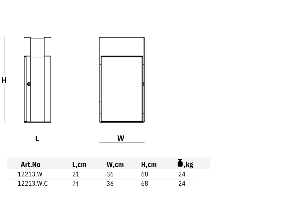 Trash Bin 12213.W is a wall-mounted, an alternative to the standard free-standing version. It comprises the same features as the standard waste bins.